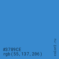 Цвет #3789CE в цветовой модели RGB обозначается тремя октетами (55, 137, 206) в десятичном формате и #3789CE в шестнадцатиричном (hex) формате, которые являются интенсивностью красного 55 (hex 37), интенсивность зелёного 137 (hex 89) и интенсивность синего 206 (hex CE).