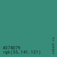 Цвет #378D79 в цветовой модели RGB обозначается тремя октетами (55, 141, 121) в десятичном формате и #378D79 в шестнадцатиричном (hex) формате, которые являются интенсивностью красного 55 (hex 37), интенсивность зелёного 141 (hex 8D) и интенсивность синего 121 (hex 79).