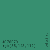 Цвет #378F70 в цветовой модели RGB обозначается тремя октетами (55, 143, 112) в десятичном формате и #378F70 в шестнадцатиричном (hex) формате, которые являются интенсивностью красного 55 (hex 37), интенсивность зелёного 143 (hex 8F) и интенсивность синего 112 (hex 70).