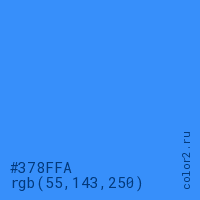 Цвет #378FFA в цветовой модели RGB обозначается тремя октетами (55, 143, 250) в десятичном формате и #378FFA в шестнадцатиричном (hex) формате, которые являются интенсивностью красного 55 (hex 37), интенсивность зелёного 143 (hex 8F) и интенсивность синего 250 (hex FA).