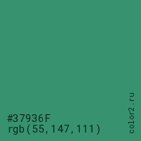 Цвет #37936F в цветовой модели RGB обозначается тремя октетами (55, 147, 111) в десятичном формате и #37936F в шестнадцатиричном (hex) формате, которые являются интенсивностью красного 55 (hex 37), интенсивность зелёного 147 (hex 93) и интенсивность синего 111 (hex 6F).