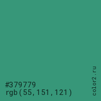 Цвет #379779 в цветовой модели RGB обозначается тремя октетами (55, 151, 121) в десятичном формате и #379779 в шестнадцатиричном (hex) формате, которые являются интенсивностью красного 55 (hex 37), интенсивность зелёного 151 (hex 97) и интенсивность синего 121 (hex 79).