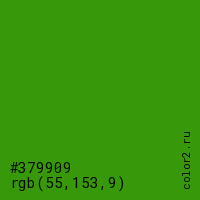 Цвет #379909 в цветовой модели RGB обозначается тремя октетами (55, 153, 9) в десятичном формате и #379909 в шестнадцатиричном (hex) формате, которые являются интенсивностью красного 55 (hex 37), интенсивность зелёного 153 (hex 99) и интенсивность синего 9 (hex 09).