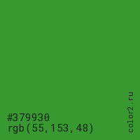 Цвет #379930 в цветовой модели RGB обозначается тремя октетами (55, 153, 48) в десятичном формате и #379930 в шестнадцатиричном (hex) формате, которые являются интенсивностью красного 55 (hex 37), интенсивность зелёного 153 (hex 99) и интенсивность синего 48 (hex 30).