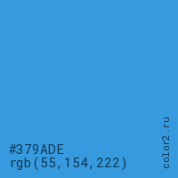 Цвет #379ADE в цветовой модели RGB обозначается тремя октетами (55, 154, 222) в десятичном формате и #379ADE в шестнадцатиричном (hex) формате, которые являются интенсивностью красного 55 (hex 37), интенсивность зелёного 154 (hex 9A) и интенсивность синего 222 (hex DE).