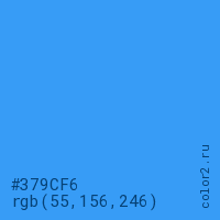 Цвет #379CF6 в цветовой модели RGB обозначается тремя октетами (55, 156, 246) в десятичном формате и #379CF6 в шестнадцатиричном (hex) формате, которые являются интенсивностью красного 55 (hex 37), интенсивность зелёного 156 (hex 9C) и интенсивность синего 246 (hex F6).
