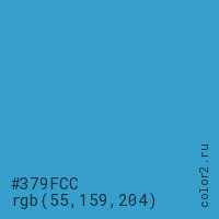 Цвет #379FCC в цветовой модели RGB обозначается тремя октетами (55, 159, 204) в десятичном формате и #379FCC в шестнадцатиричном (hex) формате, которые являются интенсивностью красного 55 (hex 37), интенсивность зелёного 159 (hex 9F) и интенсивность синего 204 (hex CC).