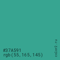 Цвет #37A591 в цветовой модели RGB обозначается тремя октетами (55, 165, 145) в десятичном формате и #37A591 в шестнадцатиричном (hex) формате, которые являются интенсивностью красного 55 (hex 37), интенсивность зелёного 165 (hex A5) и интенсивность синего 145 (hex 91).