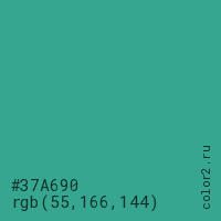 Цвет #37A690 в цветовой модели RGB обозначается тремя октетами (55, 166, 144) в десятичном формате и #37A690 в шестнадцатиричном (hex) формате, которые являются интенсивностью красного 55 (hex 37), интенсивность зелёного 166 (hex A6) и интенсивность синего 144 (hex 90).