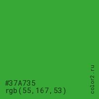 Цвет #37A735 в цветовой модели RGB обозначается тремя октетами (55, 167, 53) в десятичном формате и #37A735 в шестнадцатиричном (hex) формате, которые являются интенсивностью красного 55 (hex 37), интенсивность зелёного 167 (hex A7) и интенсивность синего 53 (hex 35).