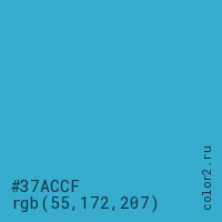 Цвет #37ACCF в цветовой модели RGB обозначается тремя октетами (55, 172, 207) в десятичном формате и #37ACCF в шестнадцатиричном (hex) формате, которые являются интенсивностью красного 55 (hex 37), интенсивность зелёного 172 (hex AC) и интенсивность синего 207 (hex CF).