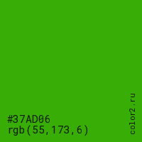 Цвет #37AD06 в цветовой модели RGB обозначается тремя октетами (55, 173, 6) в десятичном формате и #37AD06 в шестнадцатиричном (hex) формате, которые являются интенсивностью красного 55 (hex 37), интенсивность зелёного 173 (hex AD) и интенсивность синего 6 (hex 06).