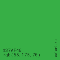 Цвет #37AF46 в цветовой модели RGB обозначается тремя октетами (55, 175, 70) в десятичном формате и #37AF46 в шестнадцатиричном (hex) формате, которые являются интенсивностью красного 55 (hex 37), интенсивность зелёного 175 (hex AF) и интенсивность синего 70 (hex 46).