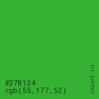 Цвет #37B134 в цветовой модели RGB обозначается тремя октетами (55, 177, 52) в десятичном формате и #37B134 в шестнадцатиричном (hex) формате, которые являются интенсивностью красного 55 (hex 37), интенсивность зелёного 177 (hex B1) и интенсивность синего 52 (hex 34).