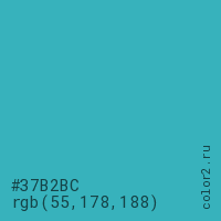 Цвет #37B2BC в цветовой модели RGB обозначается тремя октетами (55, 178, 188) в десятичном формате и #37B2BC в шестнадцатиричном (hex) формате, которые являются интенсивностью красного 55 (hex 37), интенсивность зелёного 178 (hex B2) и интенсивность синего 188 (hex BC).