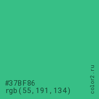 Цвет #37BF86 в цветовой модели RGB обозначается тремя октетами (55, 191, 134) в десятичном формате и #37BF86 в шестнадцатиричном (hex) формате, которые являются интенсивностью красного 55 (hex 37), интенсивность зелёного 191 (hex BF) и интенсивность синего 134 (hex 86).