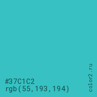 Цвет #37C1C2 в цветовой модели RGB обозначается тремя октетами (55, 193, 194) в десятичном формате и #37C1C2 в шестнадцатиричном (hex) формате, которые являются интенсивностью красного 55 (hex 37), интенсивность зелёного 193 (hex C1) и интенсивность синего 194 (hex C2).