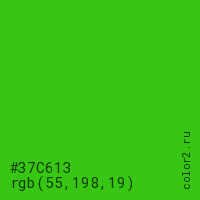 Цвет #37C613 в цветовой модели RGB обозначается тремя октетами (55, 198, 19) в десятичном формате и #37C613 в шестнадцатиричном (hex) формате, которые являются интенсивностью красного 55 (hex 37), интенсивность зелёного 198 (hex C6) и интенсивность синего 19 (hex 13).