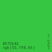 Цвет #37C642 в цветовой модели RGB обозначается тремя октетами (55, 198, 66) в десятичном формате и #37C642 в шестнадцатиричном (hex) формате, которые являются интенсивностью красного 55 (hex 37), интенсивность зелёного 198 (hex C6) и интенсивность синего 66 (hex 42).
