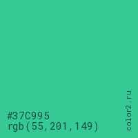 Цвет #37C995 в цветовой модели RGB обозначается тремя октетами (55, 201, 149) в десятичном формате и #37C995 в шестнадцатиричном (hex) формате, которые являются интенсивностью красного 55 (hex 37), интенсивность зелёного 201 (hex C9) и интенсивность синего 149 (hex 95).