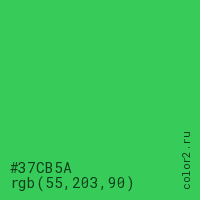 Цвет #37CB5A в цветовой модели RGB обозначается тремя октетами (55, 203, 90) в десятичном формате и #37CB5A в шестнадцатиричном (hex) формате, которые являются интенсивностью красного 55 (hex 37), интенсивность зелёного 203 (hex CB) и интенсивность синего 90 (hex 5A).