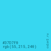 Цвет #37D7F0 в цветовой модели RGB обозначается тремя октетами (55, 215, 240) в десятичном формате и #37D7F0 в шестнадцатиричном (hex) формате, которые являются интенсивностью красного 55 (hex 37), интенсивность зелёного 215 (hex D7) и интенсивность синего 240 (hex F0).
