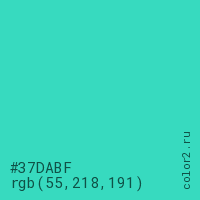 Цвет #37DABF в цветовой модели RGB обозначается тремя октетами (55, 218, 191) в десятичном формате и #37DABF в шестнадцатиричном (hex) формате, которые являются интенсивностью красного 55 (hex 37), интенсивность зелёного 218 (hex DA) и интенсивность синего 191 (hex BF).