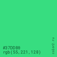 Цвет #37DD80 в цветовой модели RGB обозначается тремя октетами (55, 221, 128) в десятичном формате и #37DD80 в шестнадцатиричном (hex) формате, которые являются интенсивностью красного 55 (hex 37), интенсивность зелёного 221 (hex DD) и интенсивность синего 128 (hex 80).
