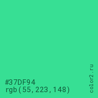 Цвет #37DF94 в цветовой модели RGB обозначается тремя октетами (55, 223, 148) в десятичном формате и #37DF94 в шестнадцатиричном (hex) формате, которые являются интенсивностью красного 55 (hex 37), интенсивность зелёного 223 (hex DF) и интенсивность синего 148 (hex 94).