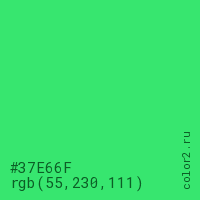 Цвет #37E66F в цветовой модели RGB обозначается тремя октетами (55, 230, 111) в десятичном формате и #37E66F в шестнадцатиричном (hex) формате, которые являются интенсивностью красного 55 (hex 37), интенсивность зелёного 230 (hex E6) и интенсивность синего 111 (hex 6F).