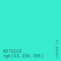 Цвет #37ECCE в цветовой модели RGB обозначается тремя октетами (55, 236, 206) в десятичном формате и #37ECCE в шестнадцатиричном (hex) формате, которые являются интенсивностью красного 55 (hex 37), интенсивность зелёного 236 (hex EC) и интенсивность синего 206 (hex CE).