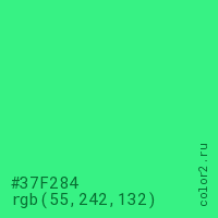 Цвет #37F284 в цветовой модели RGB обозначается тремя октетами (55, 242, 132) в десятичном формате и #37F284 в шестнадцатиричном (hex) формате, которые являются интенсивностью красного 55 (hex 37), интенсивность зелёного 242 (hex F2) и интенсивность синего 132 (hex 84).
