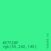 Цвет #37F28F в цветовой модели RGB обозначается тремя октетами (55, 242, 143) в десятичном формате и #37F28F в шестнадцатиричном (hex) формате, которые являются интенсивностью красного 55 (hex 37), интенсивность зелёного 242 (hex F2) и интенсивность синего 143 (hex 8F).