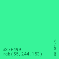 Цвет #37F499 в цветовой модели RGB обозначается тремя октетами (55, 244, 153) в десятичном формате и #37F499 в шестнадцатиричном (hex) формате, которые являются интенсивностью красного 55 (hex 37), интенсивность зелёного 244 (hex F4) и интенсивность синего 153 (hex 99).