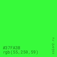 Цвет #37FA3B в цветовой модели RGB обозначается тремя октетами (55, 250, 59) в десятичном формате и #37FA3B в шестнадцатиричном (hex) формате, которые являются интенсивностью красного 55 (hex 37), интенсивность зелёного 250 (hex FA) и интенсивность синего 59 (hex 3B).