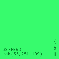 Цвет #37FB6D в цветовой модели RGB обозначается тремя октетами (55, 251, 109) в десятичном формате и #37FB6D в шестнадцатиричном (hex) формате, которые являются интенсивностью красного 55 (hex 37), интенсивность зелёного 251 (hex FB) и интенсивность синего 109 (hex 6D).
