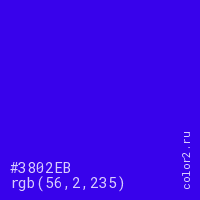 Цвет #3802EB в цветовой модели RGB обозначается тремя октетами (56, 2, 235) в десятичном формате и #3802EB в шестнадцатиричном (hex) формате, которые являются интенсивностью красного 56 (hex 38), интенсивность зелёного 2 (hex 02) и интенсивность синего 235 (hex EB).