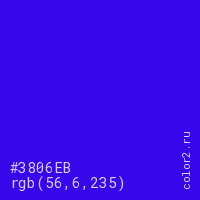 Цвет #3806EB в цветовой модели RGB обозначается тремя октетами (56, 6, 235) в десятичном формате и #3806EB в шестнадцатиричном (hex) формате, которые являются интенсивностью красного 56 (hex 38), интенсивность зелёного 6 (hex 06) и интенсивность синего 235 (hex EB).