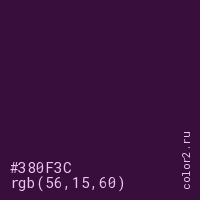 Цвет #380F3C в цветовой модели RGB обозначается тремя октетами (56, 15, 60) в десятичном формате и #380F3C в шестнадцатиричном (hex) формате, которые являются интенсивностью красного 56 (hex 38), интенсивность зелёного 15 (hex 0F) и интенсивность синего 60 (hex 3C).