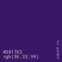 Цвет #381763 в цветовой модели RGB обозначается тремя октетами (56, 23, 99) в десятичном формате и #381763 в шестнадцатиричном (hex) формате, которые являются интенсивностью красного 56 (hex 38), интенсивность зелёного 23 (hex 17) и интенсивность синего 99 (hex 63).