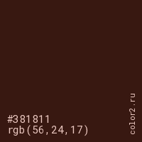 Цвет #381811 в цветовой модели RGB обозначается тремя октетами (56, 24, 17) в десятичном формате и #381811 в шестнадцатиричном (hex) формате, которые являются интенсивностью красного 56 (hex 38), интенсивность зелёного 24 (hex 18) и интенсивность синего 17 (hex 11).