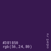Цвет #381850 в цветовой модели RGB обозначается тремя октетами (56, 24, 80) в десятичном формате и #381850 в шестнадцатиричном (hex) формате, которые являются интенсивностью красного 56 (hex 38), интенсивность зелёного 24 (hex 18) и интенсивность синего 80 (hex 50).