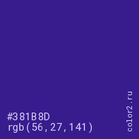 Цвет #381B8D в цветовой модели RGB обозначается тремя октетами (56, 27, 141) в десятичном формате и #381B8D в шестнадцатиричном (hex) формате, которые являются интенсивностью красного 56 (hex 38), интенсивность зелёного 27 (hex 1B) и интенсивность синего 141 (hex 8D).