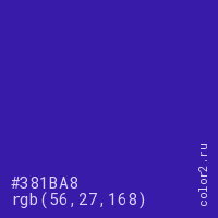 Цвет #381BA8 в цветовой модели RGB обозначается тремя октетами (56, 27, 168) в десятичном формате и #381BA8 в шестнадцатиричном (hex) формате, которые являются интенсивностью красного 56 (hex 38), интенсивность зелёного 27 (hex 1B) и интенсивность синего 168 (hex A8).
