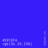 Цвет #381DFA в цветовой модели RGB обозначается тремя октетами (56, 29, 250) в десятичном формате и #381DFA в шестнадцатиричном (hex) формате, которые являются интенсивностью красного 56 (hex 38), интенсивность зелёного 29 (hex 1D) и интенсивность синего 250 (hex FA).