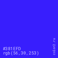 Цвет #381EFD в цветовой модели RGB обозначается тремя октетами (56, 30, 253) в десятичном формате и #381EFD в шестнадцатиричном (hex) формате, которые являются интенсивностью красного 56 (hex 38), интенсивность зелёного 30 (hex 1E) и интенсивность синего 253 (hex FD).
