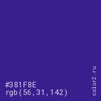 Цвет #381F8E в цветовой модели RGB обозначается тремя октетами (56, 31, 142) в десятичном формате и #381F8E в шестнадцатиричном (hex) формате, которые являются интенсивностью красного 56 (hex 38), интенсивность зелёного 31 (hex 1F) и интенсивность синего 142 (hex 8E).