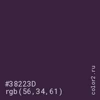 Цвет #38223D в цветовой модели RGB обозначается тремя октетами (56, 34, 61) в десятичном формате и #38223D в шестнадцатиричном (hex) формате, которые являются интенсивностью красного 56 (hex 38), интенсивность зелёного 34 (hex 22) и интенсивность синего 61 (hex 3D).
