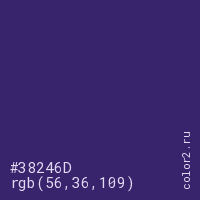 Цвет #38246D в цветовой модели RGB обозначается тремя октетами (56, 36, 109) в десятичном формате и #38246D в шестнадцатиричном (hex) формате, которые являются интенсивностью красного 56 (hex 38), интенсивность зелёного 36 (hex 24) и интенсивность синего 109 (hex 6D).