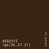 Цвет #382515 в цветовой модели RGB обозначается тремя октетами (56, 37, 21) в десятичном формате и #382515 в шестнадцатиричном (hex) формате, которые являются интенсивностью красного 56 (hex 38), интенсивность зелёного 37 (hex 25) и интенсивность синего 21 (hex 15).